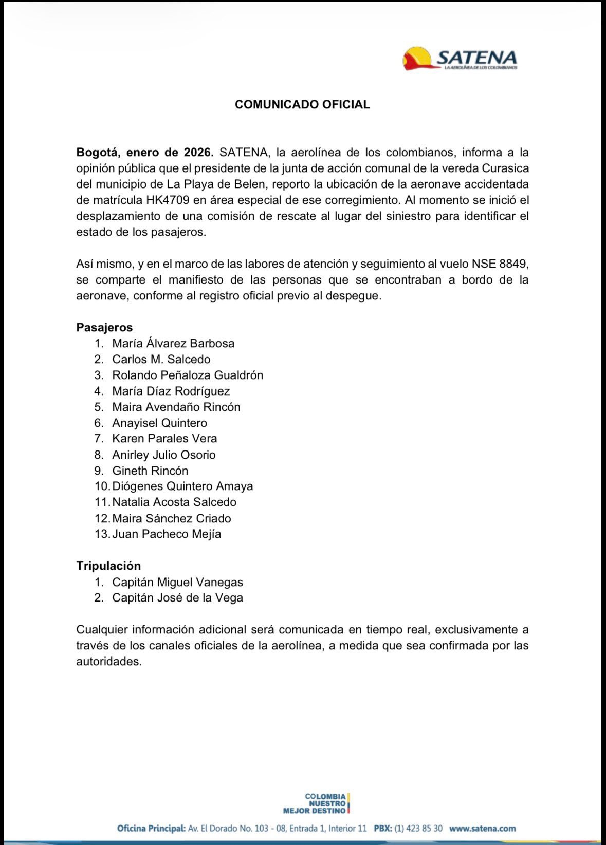 Por su parte, la aerolínea estatal Satena confirmó que el reporte inicial fue realizado por el presidente de la Junta de Acción Comunal de la vereda Curasica. La compañía había informado previamente que la aeronave habría agotado su autonomía de vuelo luego de perder contacto, y que la baliza de emergencia no se activó, lo que dificultó la búsqueda.