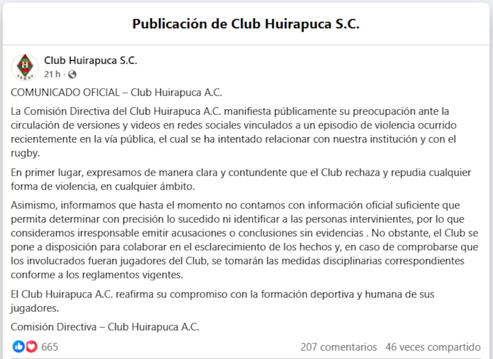 “La Comisión Directiva del Club Huirapuca A.C. manifiesta públicamente su preocupación ante la circulación de versiones y videos en redes sociales vinculados a un episodio de violencia ocurrido recientemente en la vía pública, el cual se ha intentado relacionar con nuestra institución y con el rugby. En primer lugar, expresamos de manera clara y contundente que el Club rechaza y repudia cualquier forma de violencia, en cualquier ámbito”, aclararon las autoridades.