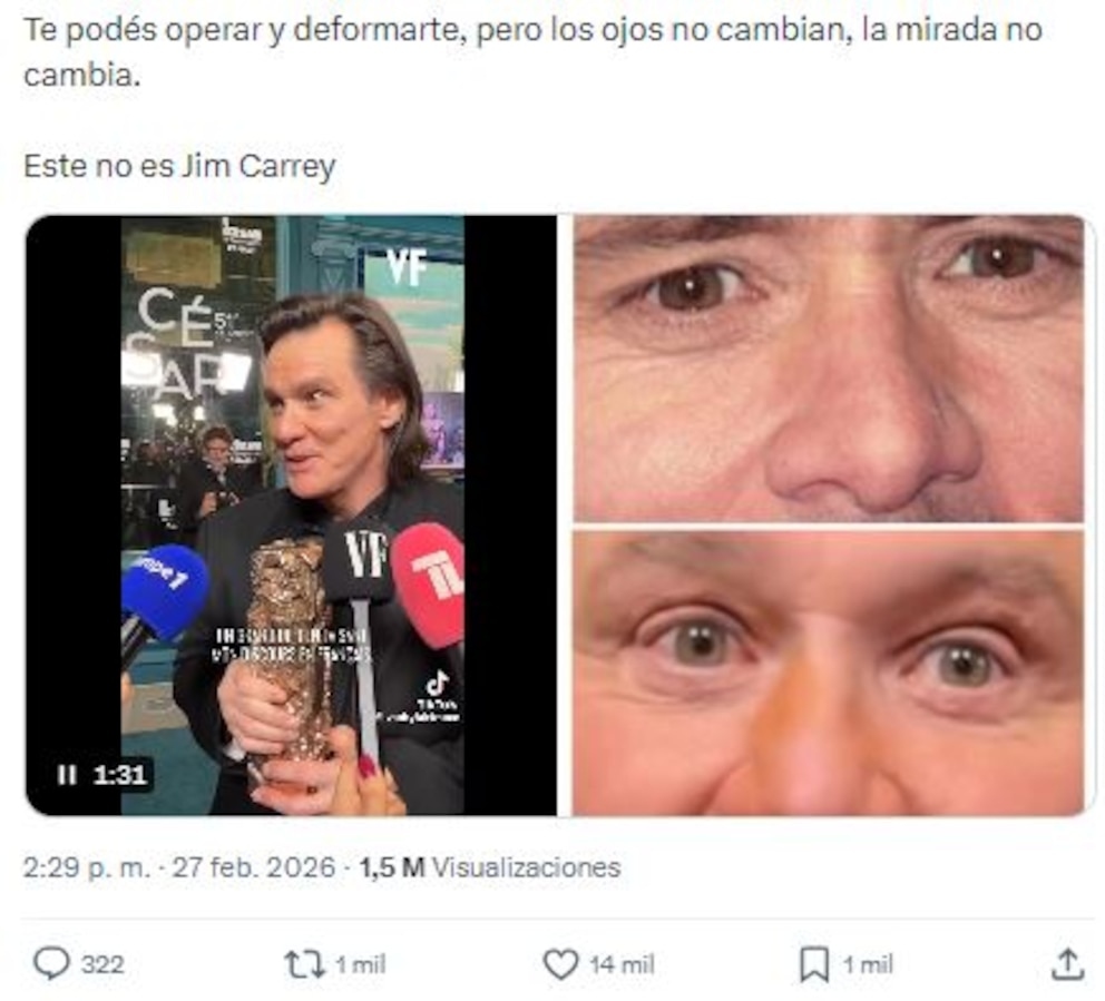 La reaparición pública de Jim Carrey en la 51ª edición de los Premios César terminó eclipsando, al menos en redes sociales, el motivo central de la noche: el homenaje a su trayectoria. El actor canadiense-estadounidense de 64 años recibió un César Honorífico el 26 de febrero en París; sin embargo, la apariencia de su rostro desató una ola de especulaciones y teorías conspirativas en plataformas digitales.