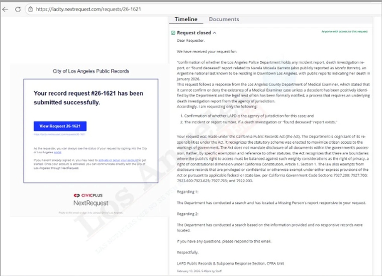 En la nota indicaron que cuando le solicitaron información al Departamento de la Policía de Los Ángeles sobre el caso, este confirmó la existencia de un reporte de persona desaparecida a nombre de Narela Micaela Barreto, pero no habría registrado ningún hallazgo de persona sin vida, ninguna investigación de muerte ni expediente policial asociado a un fallecimiento bajo esa identidad dentro de su jurisdicción.