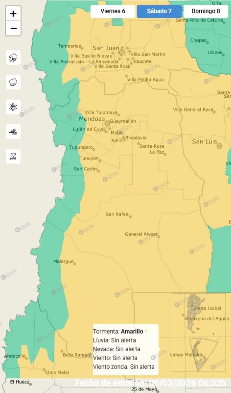 Quienes asistan al Acto Central de la Vendimia, deberán tener en cuenta que en la tarde y noche, el panorama se presenta más inestable. El Servicio Meteorológico Nacional emitió una alerta amarilla por tormentas de mayor intensidad, con caída de granizo, actividad eléctrica y ráfagas de viento.