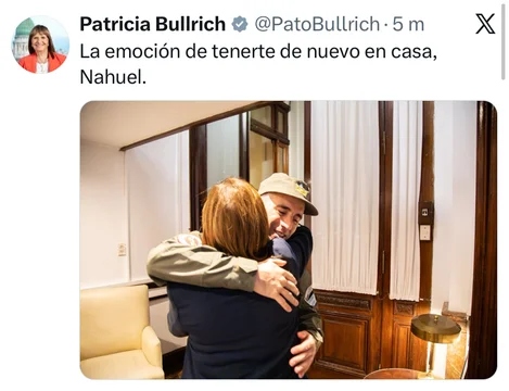 La jefa del bloque de senadores de La Libertad Avanza (LLA), Patricia Bullrich, se reunió este jueves con el gendarme Nahuel Gallo, quien fuera liberado de su detención ilegal en Venezuela después de 448 días, y denunció un intento de “apropiación” del caso por parte de la AFA.