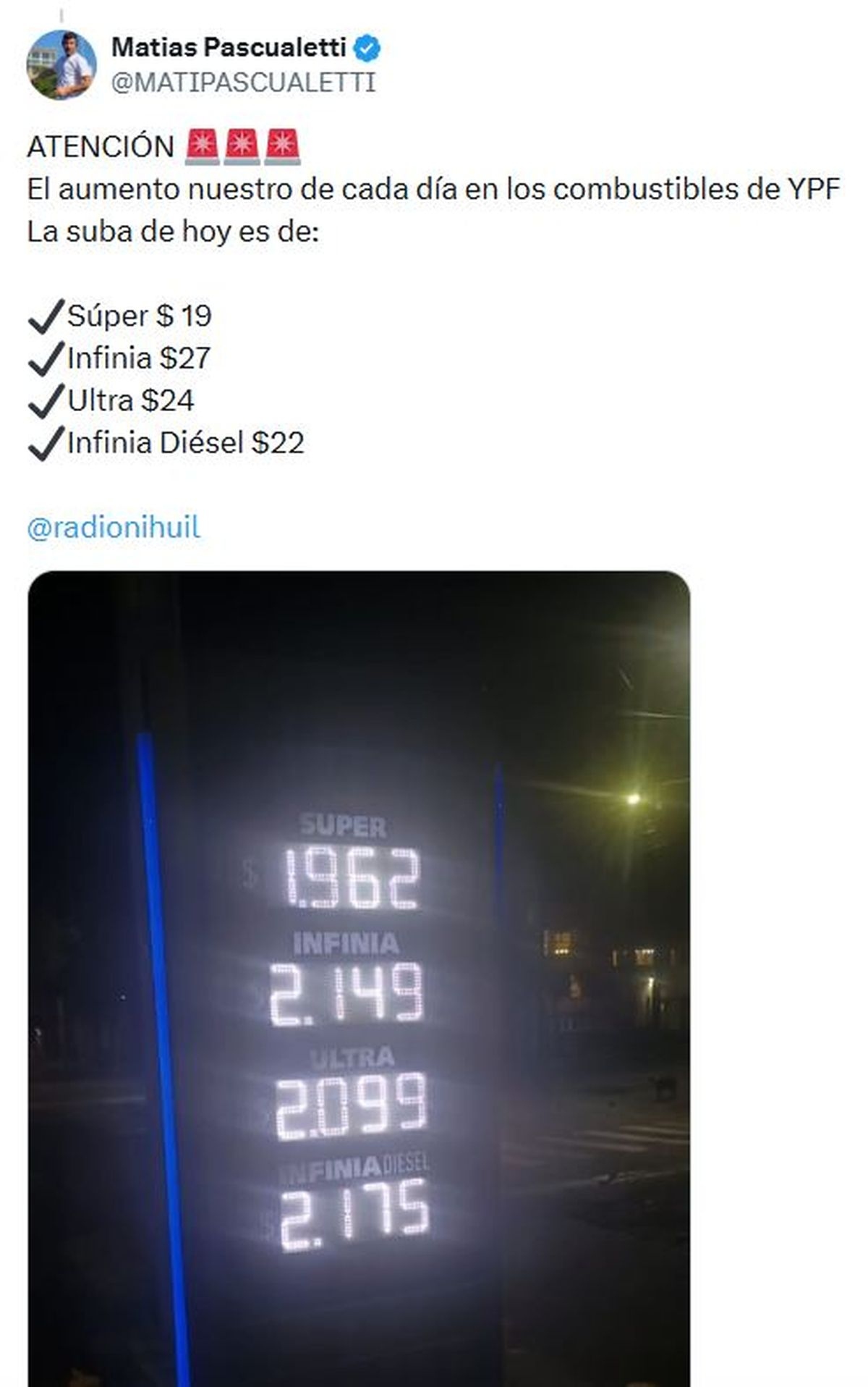Ni los feriados las pizarras de las estaciones YPF descansaron. Tampoco el día siguiente. Luego del aumento de la nafta y otros combustibles del lunes 23 y el 2.6% del martes 24 la petrolera aplicó otro incremento este miércoles para que la súper se ubique en $1962 por litro.