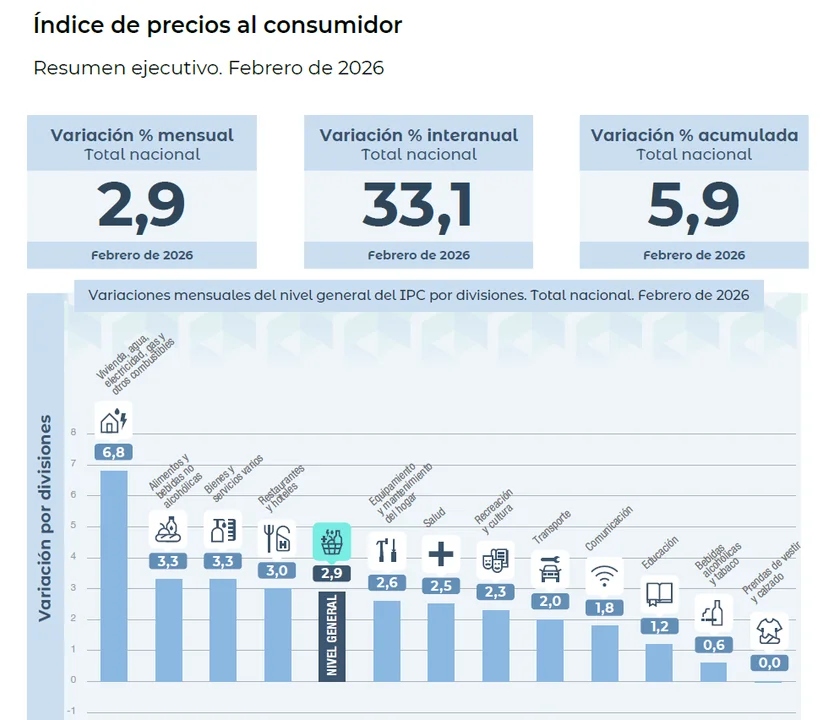 El 2,6% de febrero de este año es mayor al 2,1% de igual mes de 2025.
