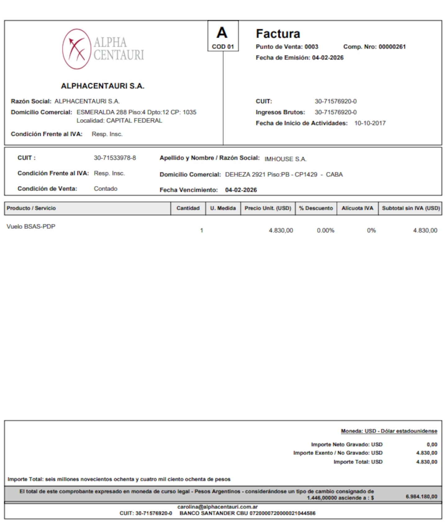 El comprobante, fechado el 9 de marzo, fue emitido por el broker aeronáutico Agustín Ismel Issin a nombre de Grandio, quien ya había afrontado el costo del vuelo de ida mediante una de sus empresas. Issin figuraba en documentación previa: aparecía en una factura emitida por AlphaCentauri por un paquete de diez vuelos fechado el 9 de febrero.