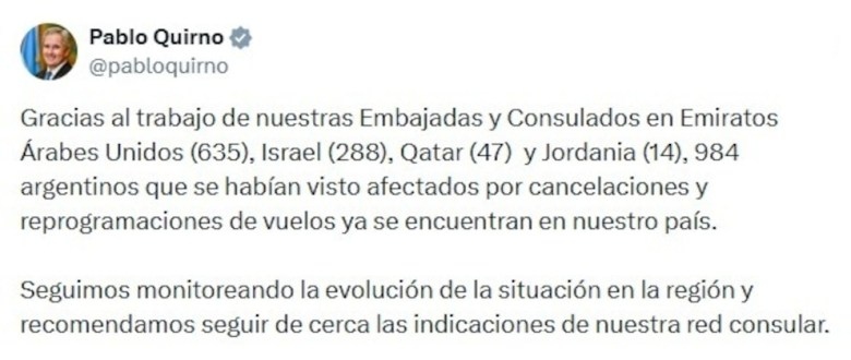Al mismo tiempo, este viernes el canciller Pablo Quirno confirmó que un total de 984 argentinos lograron regresar al país desde distintos puntos del Medio Oriente. En los últimos días llegaron distintos aviones con pasajeros argentinos evacuados.