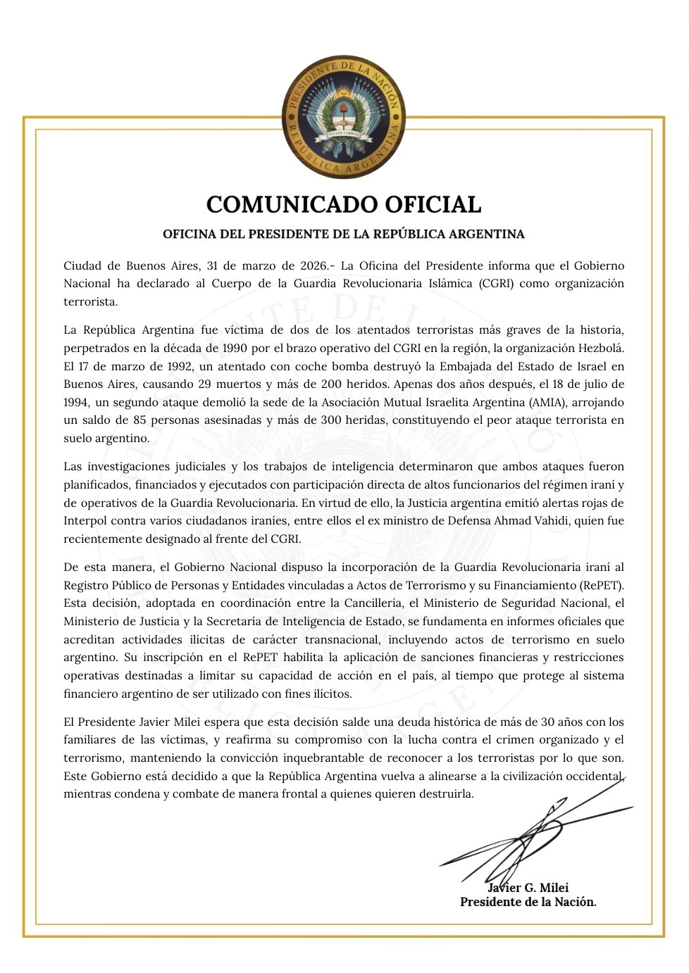 En el comunicado, el presidente Javier Milei sostuvo que esta decisión apunta a saldar una “deuda histórica” con las víctimas de los atentados y reafirmó el compromiso del país en la lucha contra el crimen organizado y el terrorismo.