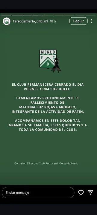 Por su parte, la Comisión Directiva del club Ferrocarril oeste de Merlo, donde la adolescente practicaba patín, también se expresó sobre el deceso: “Lamentamos profundamente el fallecimiento de Maitena. Acompañamos en este dolor tan grande a su familia, seres queridos y la comunidad del club”.