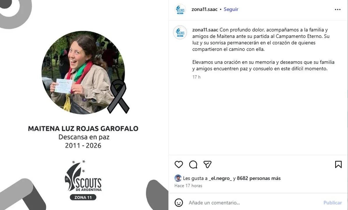 El grupo de scouts "Zona 11" al que pertenecía Maitena Luz Rojas Garófalo, la adolescente de 14 años que apareció muerta en la localidad bonaerense de Las Heras, publicó un emotivo mensaje en el que se despidió de la joven.