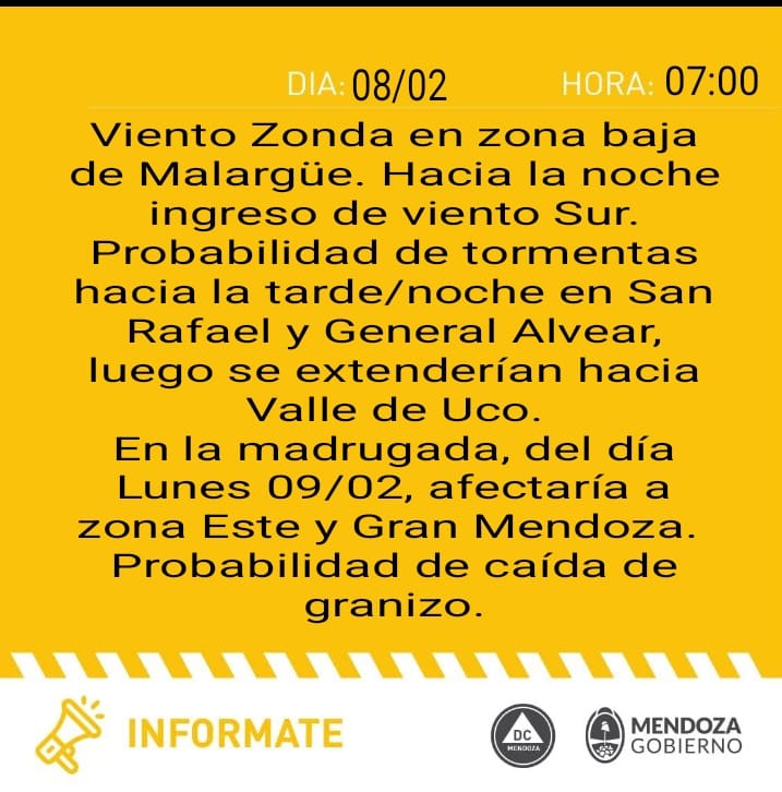 Por su parte, el parte meteorológico de la Dirección de Contingencias Climáticas que difunde Defensa Civil de la provincia complementa la información del SMN indicando que "a partir de las 20 - 21 horas inicia la convección en el Sur de Mendoza, con posibles tormentas y no se descarta la caída de granizo".