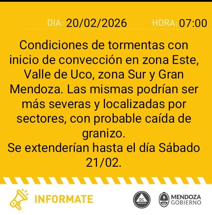 Durante la madrugada del sábado persistirán las tormentas en la zona Este y el Valle de Uco. Las temperaturas en el llano registrarán una mínima de 17°C en Malargüe y sectores bajos del Valle de Uco, mientras que en el resto de la provincia se ubicará en torno a los 21°C. La máxima promedio provincial será de 27°C.