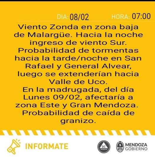 El Servicio Meteorológico Nacional dispuso un alerta en nivel amarillo en horas de la noche del domingo y madrugada del lunes para General Alvear y la zona baja de San Rafael.