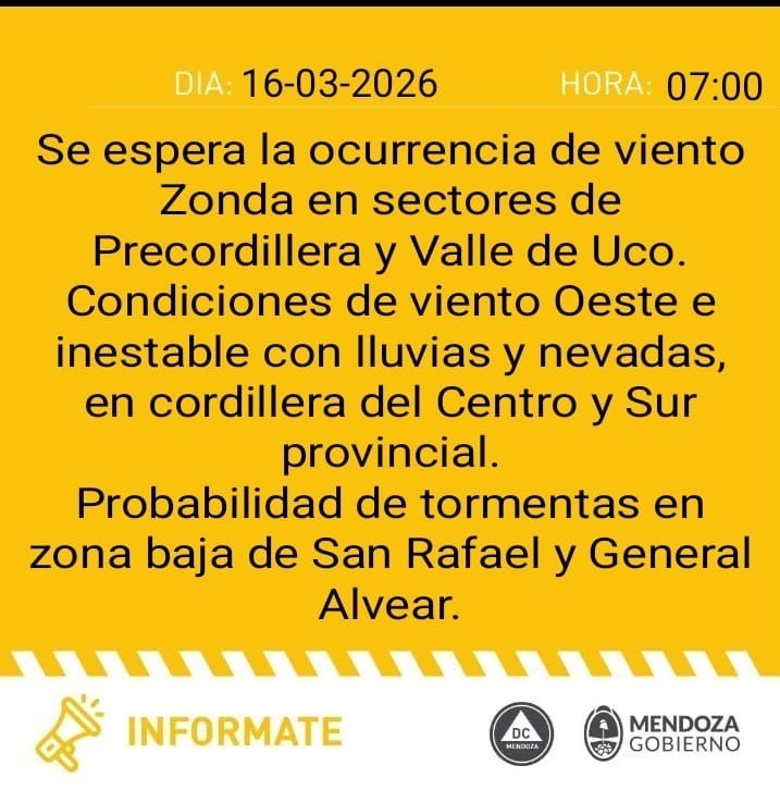 El área será afectada por viento Zonda intenso con velocidades entre 40 y 60 kilómetros por hora, con ráfagas que podrían superar puntualmente los 80 kilómetros por hora. Este fenómeno puede provocar reducción significativa de la visibilidad, un repentino aumento de temperatura y condiciones de muy baja humedad relativa.