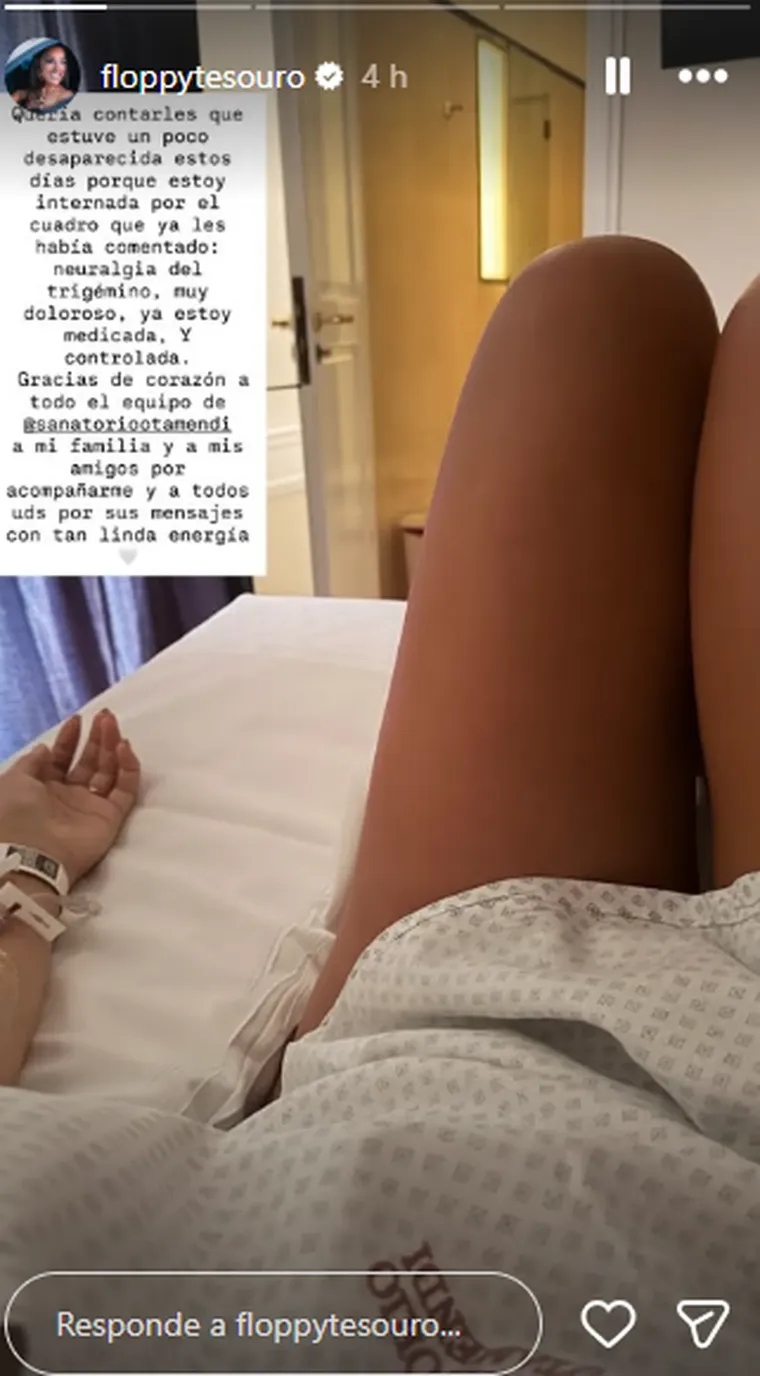 A través de sus historias de Instagram, y recostada en una de las habitaciones del nosocomio, la Tesouro puso nombre al malestar que la aqueja. “Quería contarles que estuve un poco desaparecida estos días porque estoy internada por el cuadro que ya les había comentado: Neuralgia del trigémino, muy doloroso. Ya estoy medicada y controlada”, reveló con total sinceridad.