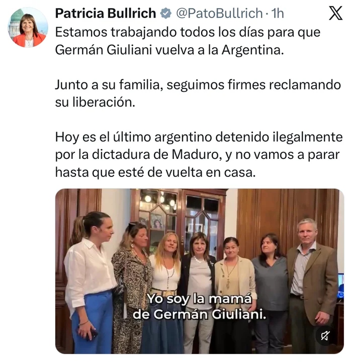 A su vez, se conoció que Patricia Bullrich, la jefa de los senadores de La Libertad Avanza, mantuvo una reunión con la familia de Germán Giuliani, detenido en Venezuela, para hablar de la situación.