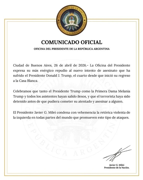 El Gobierno de Javier Milei condenó el tiroteo ocurrido durante una cena de periodistas en el hotel Washington Hilton, en Estados Unidos, evento al que asistía el presidente Donald Trump, quien fue evacuado y resultó ileso tras el episodio.