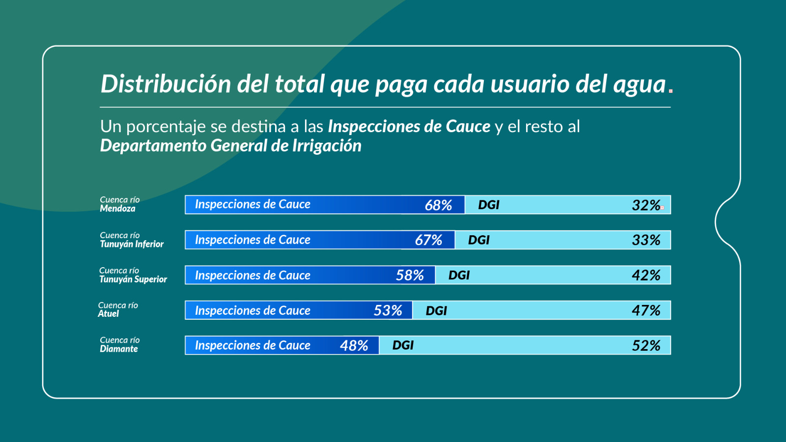 En promedio, el 60% de lo pagado va a las Inspecciones de Cauce y éstas no dependen de Irrigación. Cabe destacar que el organismo del agua es quien distribuye como “mayorista” el agua para todos sus usos, mientras que las Inspecciones de Cauce, lo hacen a nivel “minorista”. Irrigación es responsable de la gestión de los ríos, el manejo de los embalses, la operación de los diques de derivación y los canales primarios. A través de sus Subdelegaciones controla la operación del sistema y distribuye el agua a las Inspecciones de Cauce.