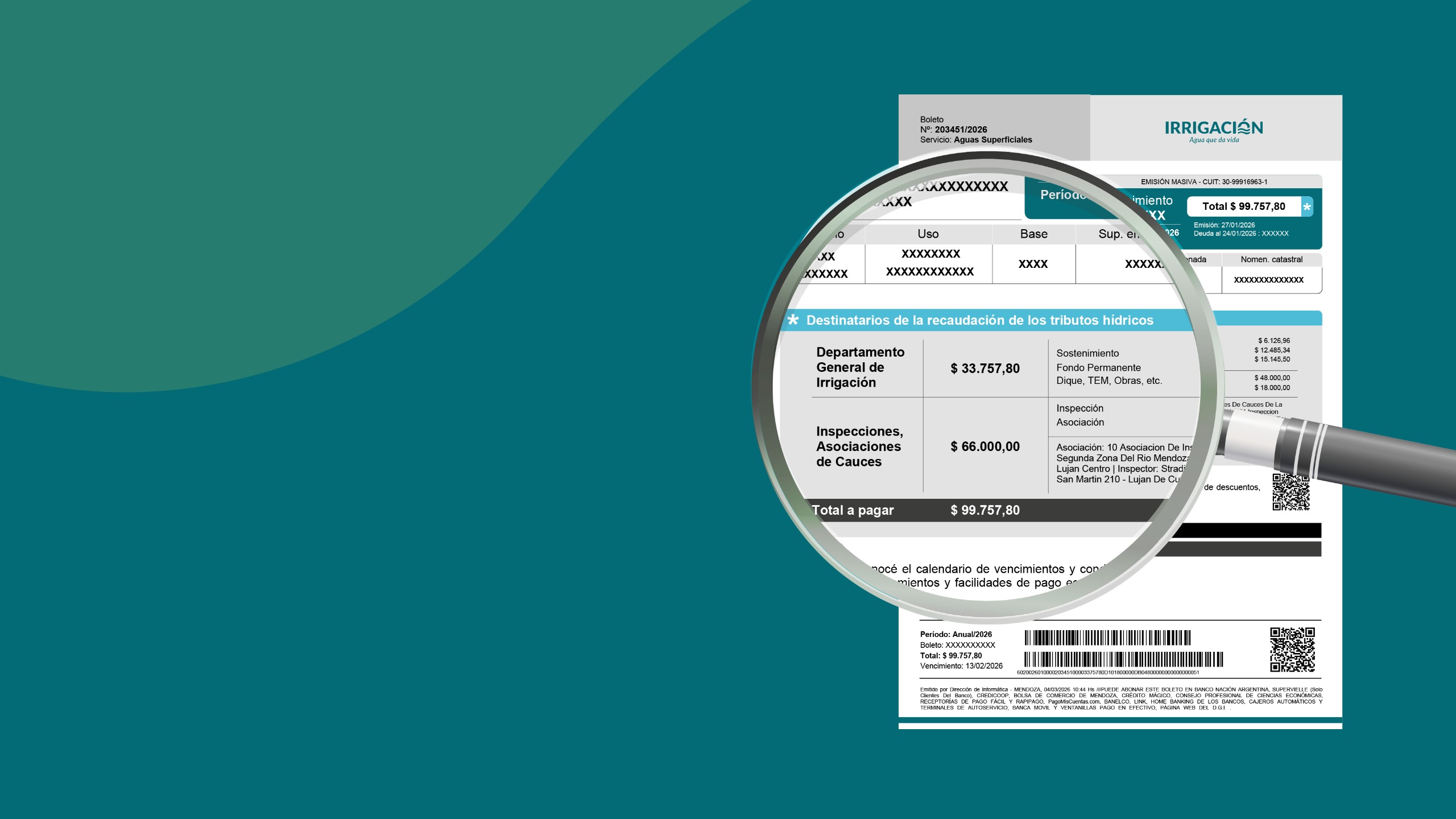 En el nuevo boleto de pago, que se recibe en forma digital desde 2024, como parte de la política de despapelización implementada por Irrigación, se aprecia quiénes son los destinatarios de la recaudación de los tributos hídricos en dos partes: Irrigación e Inspecciones/Asociaciones de Inspecciones. En el boleto aparecen algunos ítems comunes en todos los boletos y otros que figuran dependiendo la cuenca en la que esté empadronado el titular de la propiedad.