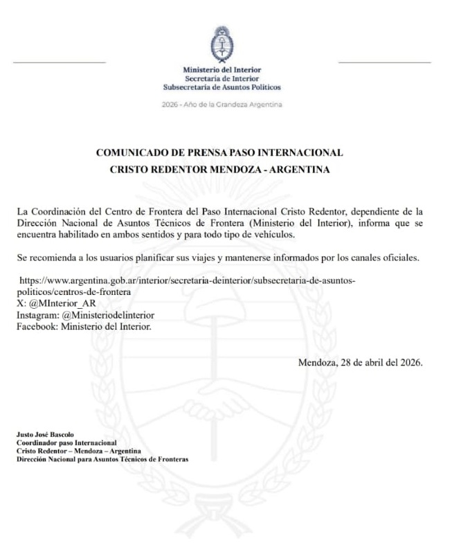 Este martes, el Paso Internacional Cristo Redentor y el Paso Pehuenche se encuentran habilitados para la circulación de vehículos en ambos sentidos, según informaron las autoridades de los complejos fronterizos.