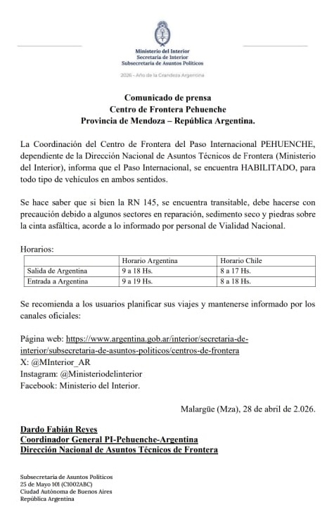El Paso Pehuenche permanecerá habilitado de 9 a 19 para todo tipo de vehículos, en ambos sentidos de circulación.