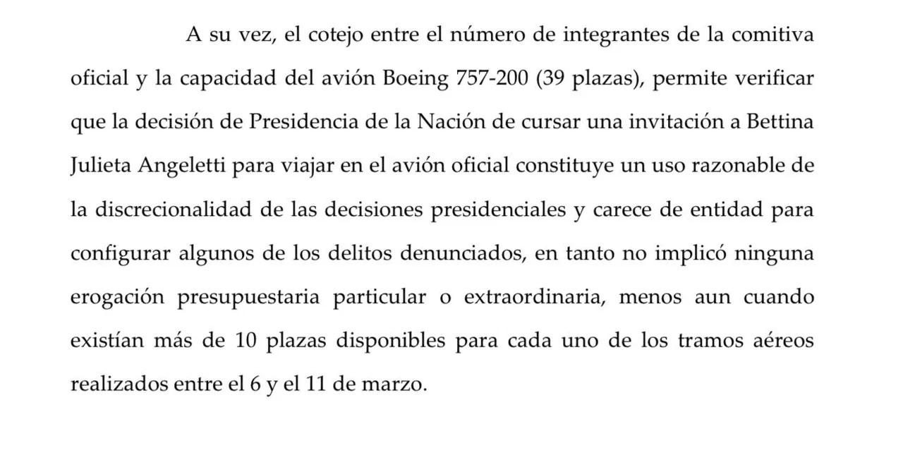Asimismo, el análisis del número de integrantes de la comitiva oficial en relación con la capacidad del avión Boeing 757-200, con 39 plazas, indica que la invitación a Bettina Julieta Angeleti se encuadra en un uso razonable de las facultades discrecionales de la Presidencia.