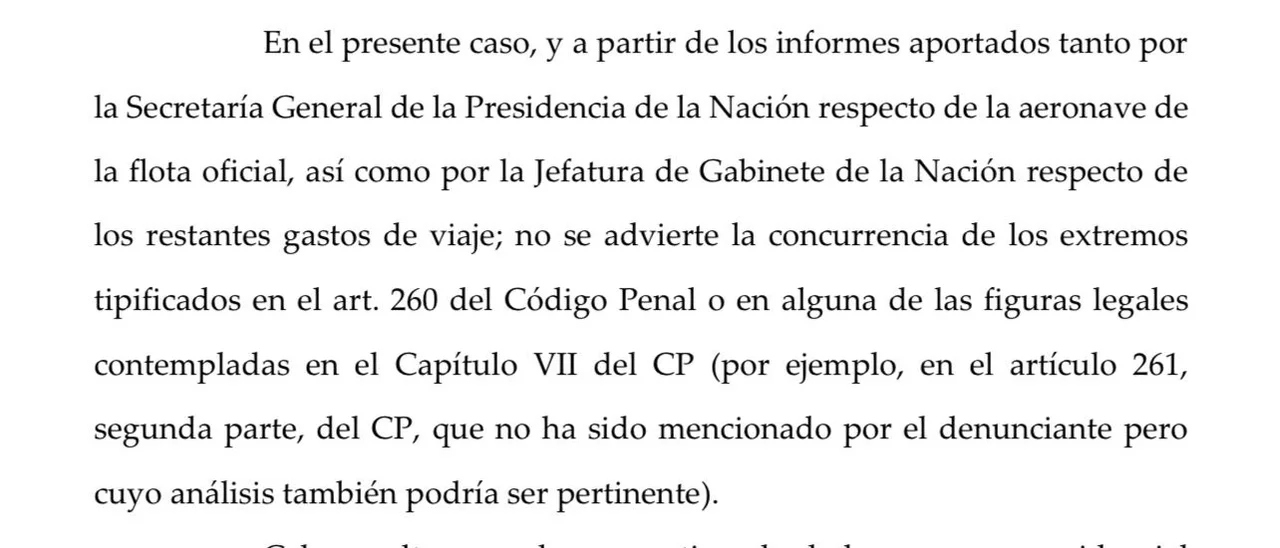 Según surge de la presentación, a partir de informes de la Secretaría General de la Presidencia y de la Jefatura de Gabinete sobre la aeronave y los gastos del viaje, no se verifican los extremos previstos en el artículo 260 del Código Penal ni en otras figuras del Capítulo VII.